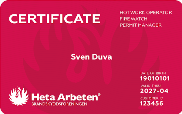 - The Heta Arbeten certificate is issued digitally through the Heta Arbeten® app, includes the exam institute logo, and is valid for 5 years. In Polish, the certificate is called Safety in Fire-risk Work.